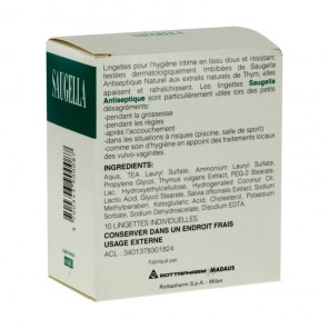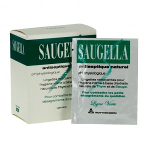 Toallitas dermatológicamente probadas, de tejido suave y resistente, impregnadas en una solución de Saugella Antiseptique, para una higiene íntima eficaz en casa o de viaje.