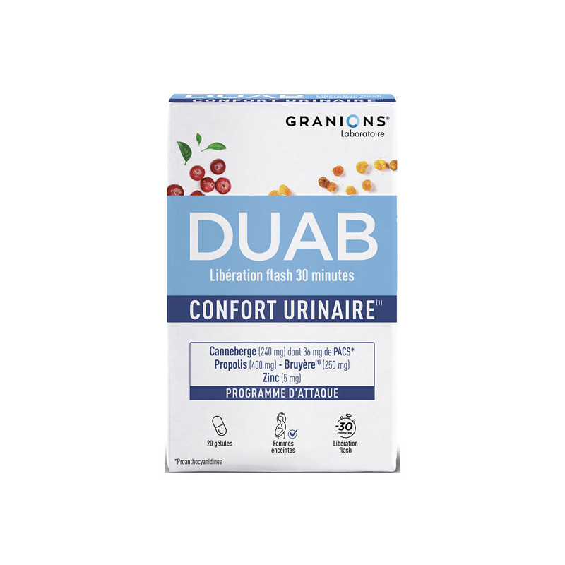 Bienestar femenino por naturaleza DUAB es una composición nutricional original, patentada y desarrollada con un instituto de investigación científica de renombre. Combina dos ingredientes, el extracto de arándano rojo (Vaccinium macrocarpon) y el propóleo.