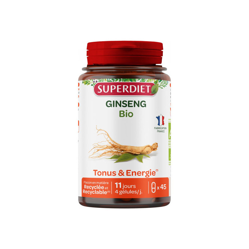 Ginseng* (racine) (support : maltodextrine*) - Amidon de riz* - Gélule d'hydroxypropylméthylcellulose