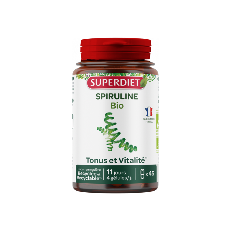Spiruline (algue entière)* (@sulfites), Gélule d'hydroxypropylméthylcellulose, Anti-agglomérant : talc
