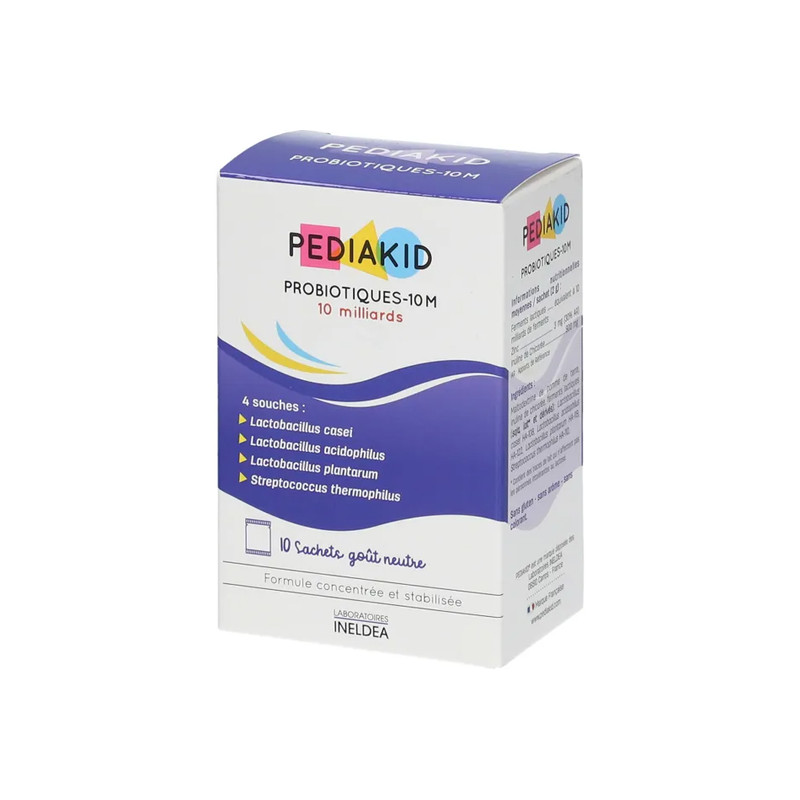 PEDIAKID Probiotiques-10M se ha desarrollado a partir de fermentos lácticos (Lactobacillus casei, Lactobacillus acidophilus, Lactobacillus plantarum, Streptococcus thermophilus) rigurosamente seleccionados para reequilibrar la flora intestinal.