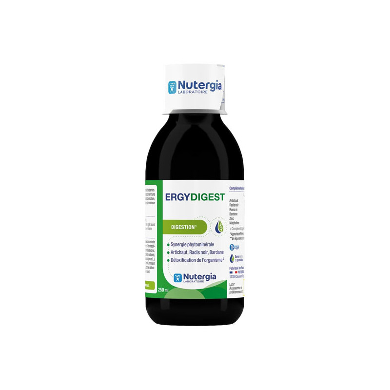ERGYDIGEST es una combinación de oligoelementos y plantas como la alcachofa, que ayuda a desintoxicar, y el romero y la bardana, que facilitan la digestión. La fórmula se completa con oligoelementos como el zinc, que interviene en el metabolismo de los azúcares, las grasas y las proteínas. El zinc y la bardana ayudan a mantener una piel sana.