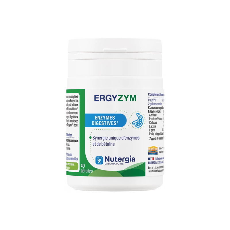 ERGYZYM puede recomendarse para favorecer el buen funcionamiento de las enzimas durante la digestión. Está especialmente indicado en caso de comidas copiosas (ricas en proteínas, hidratos de carbono, grasas, exceso de alcohol) o comidas demasiado rápidas (masticación insuficiente), así como en caso de sensibilidad digestiva al gluten o a la lactosa, por ejemplo.
