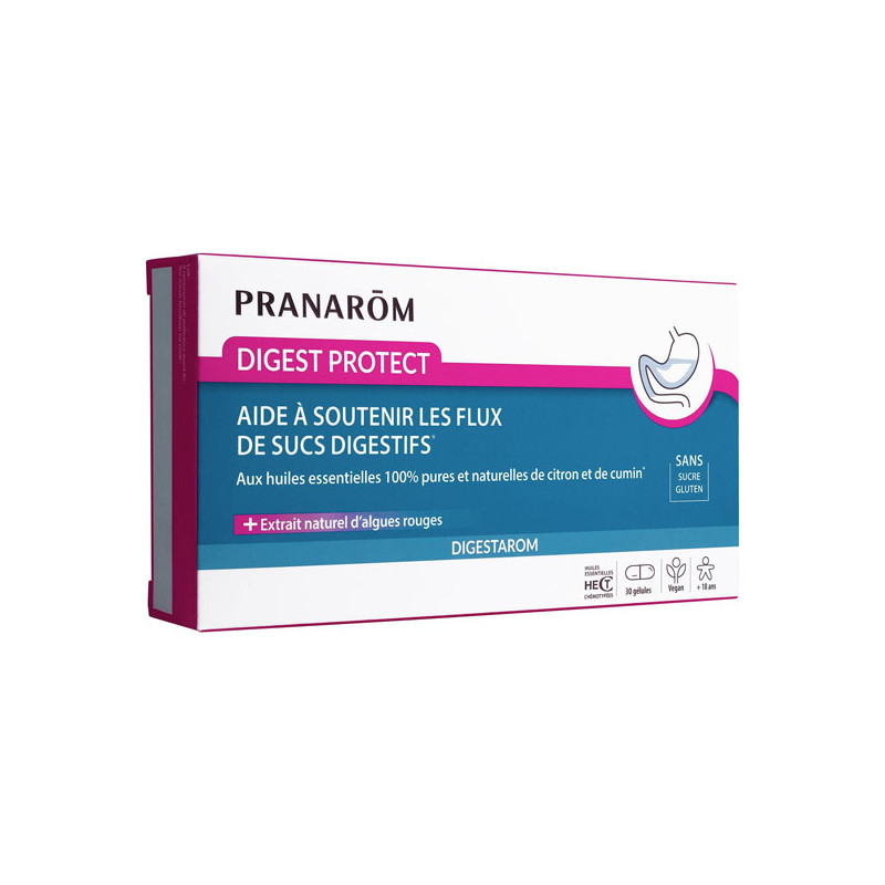 La solución Digest Protect de Pranarôm es un complemento alimenticio que combina 100 Aceites Esenciales ecológicos y raíz de malvavisco para favorecer el flujo de los jugos digestivos y combatir las molestias gástricas.