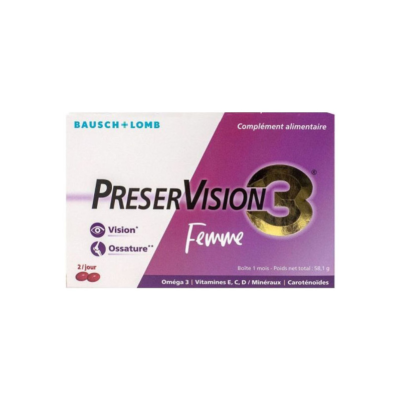 PreserVision 3 Femme es un complemento alimenticio ocular especialmente diseñado para responder a las necesidades específicas de las mujeres, con 20 µg más de vitamina D que la formulación PreserVision 3.