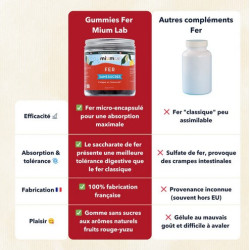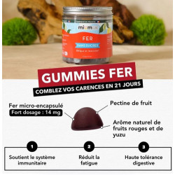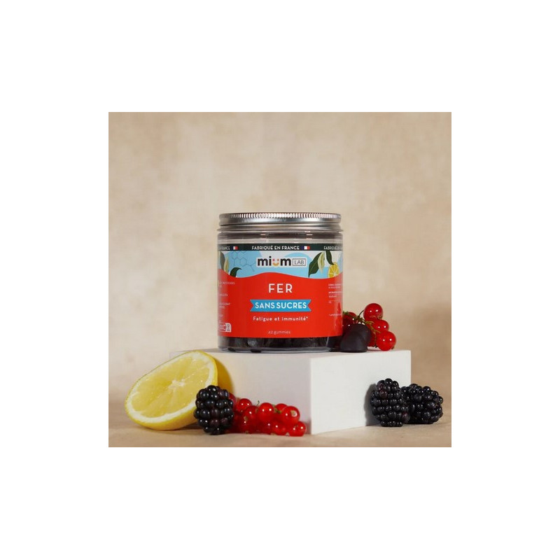 Las ventajas de Mium Lab + Fórmula rica en hierro (14 mg o 100% del valor diario) + Composición sin azúcar, vegana y sin gluten + Delicioso sabor natural a frutos rojos y yuzu (sin sabor metálico) + Primeros (y únicos) complementos alimenticios de hierro en formato gominolas en el mercado francés